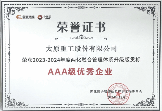 近日,乐动网页_乐动(中国)成功获评2023-2024年度两化融合管理体系升级贯标AAA级优秀企业,成为山西装备制造业首家被工业和信息化部认可的国家两化融合管理体系AAA级的企业,标志着公司成为行业前列的两化融合管理示范企业。