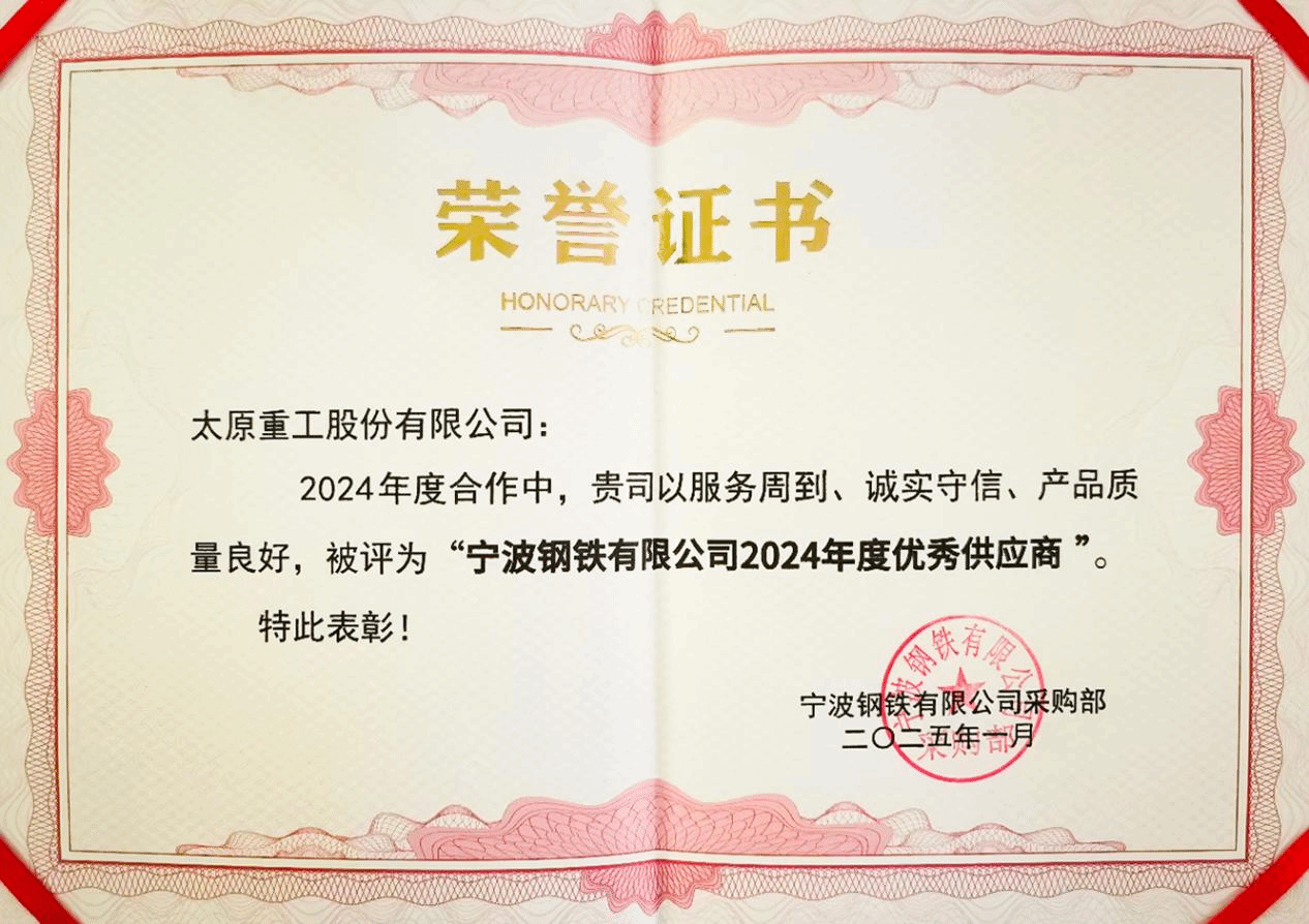 近日,凭借顶尖的技术实力、过硬的产品质量、优质的用户服务,太重荣获“宁波钢铁有限公司2024年度优秀供应商”称号。值得一提的是,公司已连续四年获得此项荣誉,成为用户供应商体系中的典范。